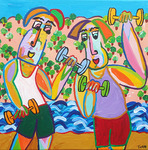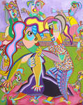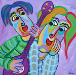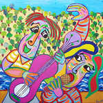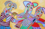 2018Schilderij Concierto para tres, acryl op linnen, samen muziek maken, fluit, saxofoon en gitaar, een concert voor drie.