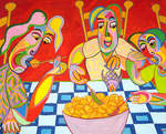 2018Schilderij, acryl op linnen, samen tijdens het eten de dag bespreken, elkaar de hele dag niet gezien, eet smakelijk