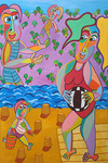 2013Geanimeerd gesprek tussen moeder, vriendin en kind op het strand. Het schilderij Zomerpassie is te huur voor 18,75 Euro per maand