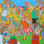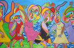 2019Schilderij Fiesta van Twan de Vos, feest op het dorpsplein, muziek, dans en zang.